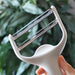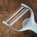 ピーラーを少し立て、先端の刃を使うと普通の皮むきや野菜の薄切りができます。