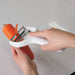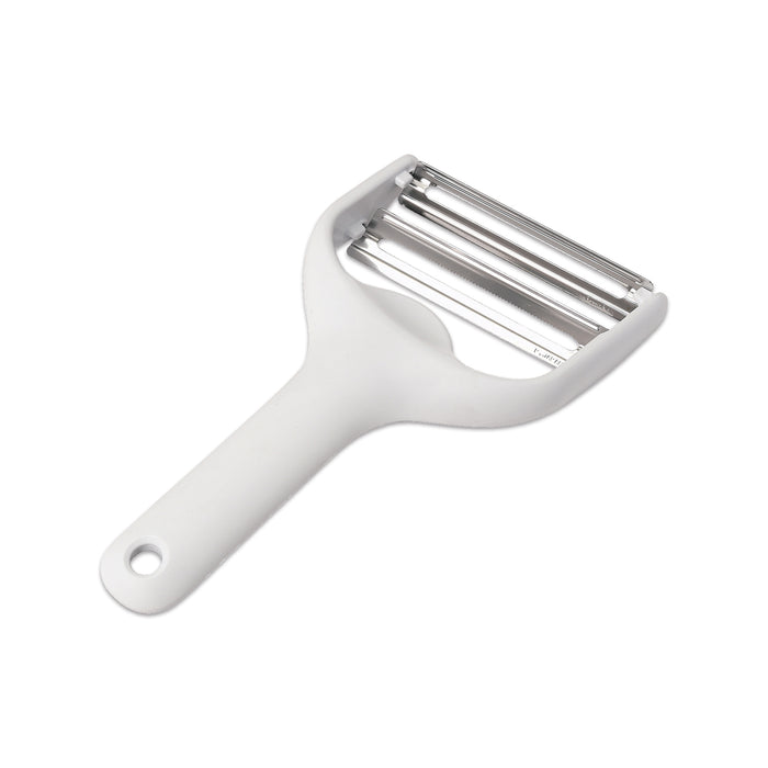 ピーラーを少し立て、先端の刃を使うと普通の皮むきや野菜の薄切りができます。